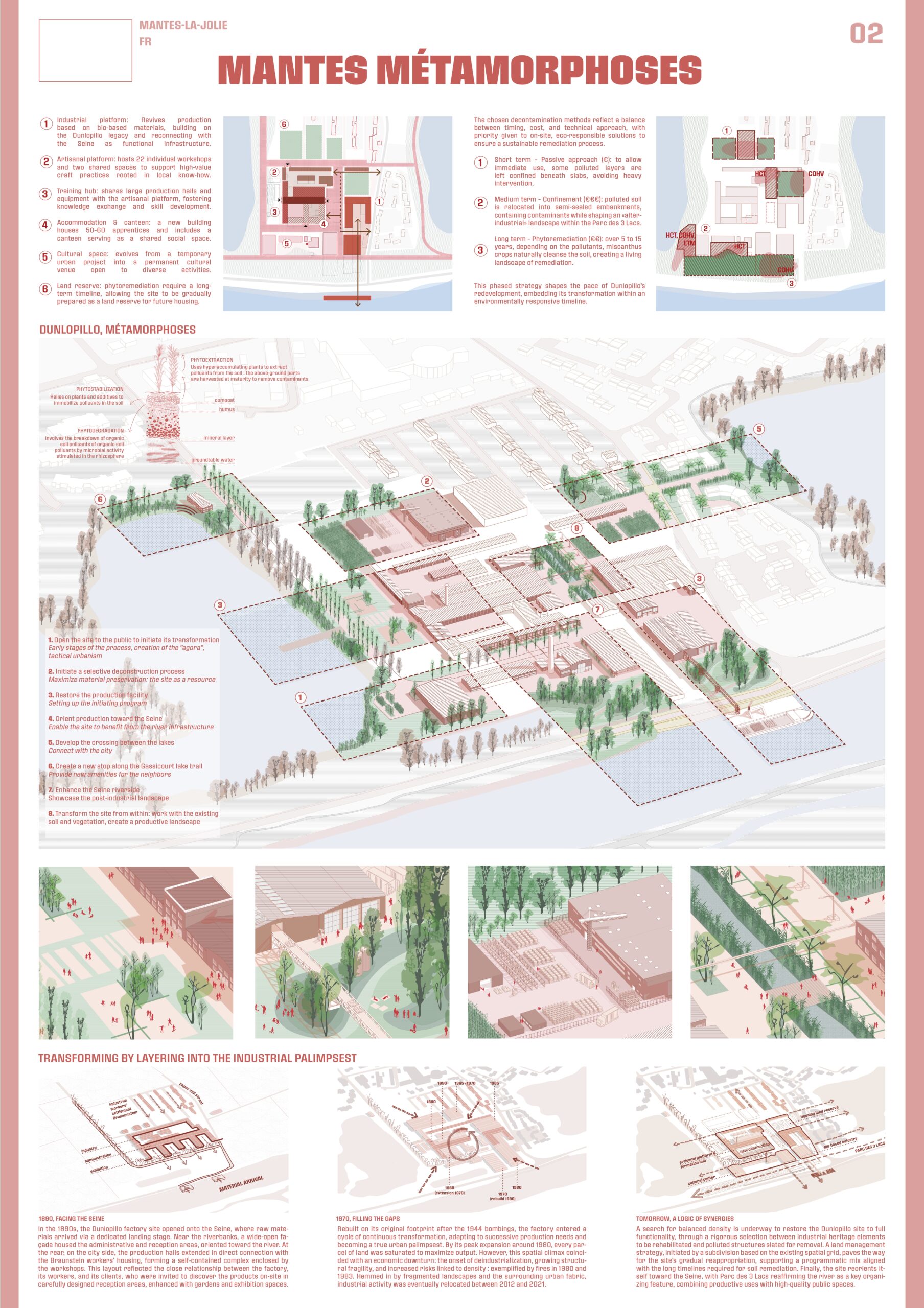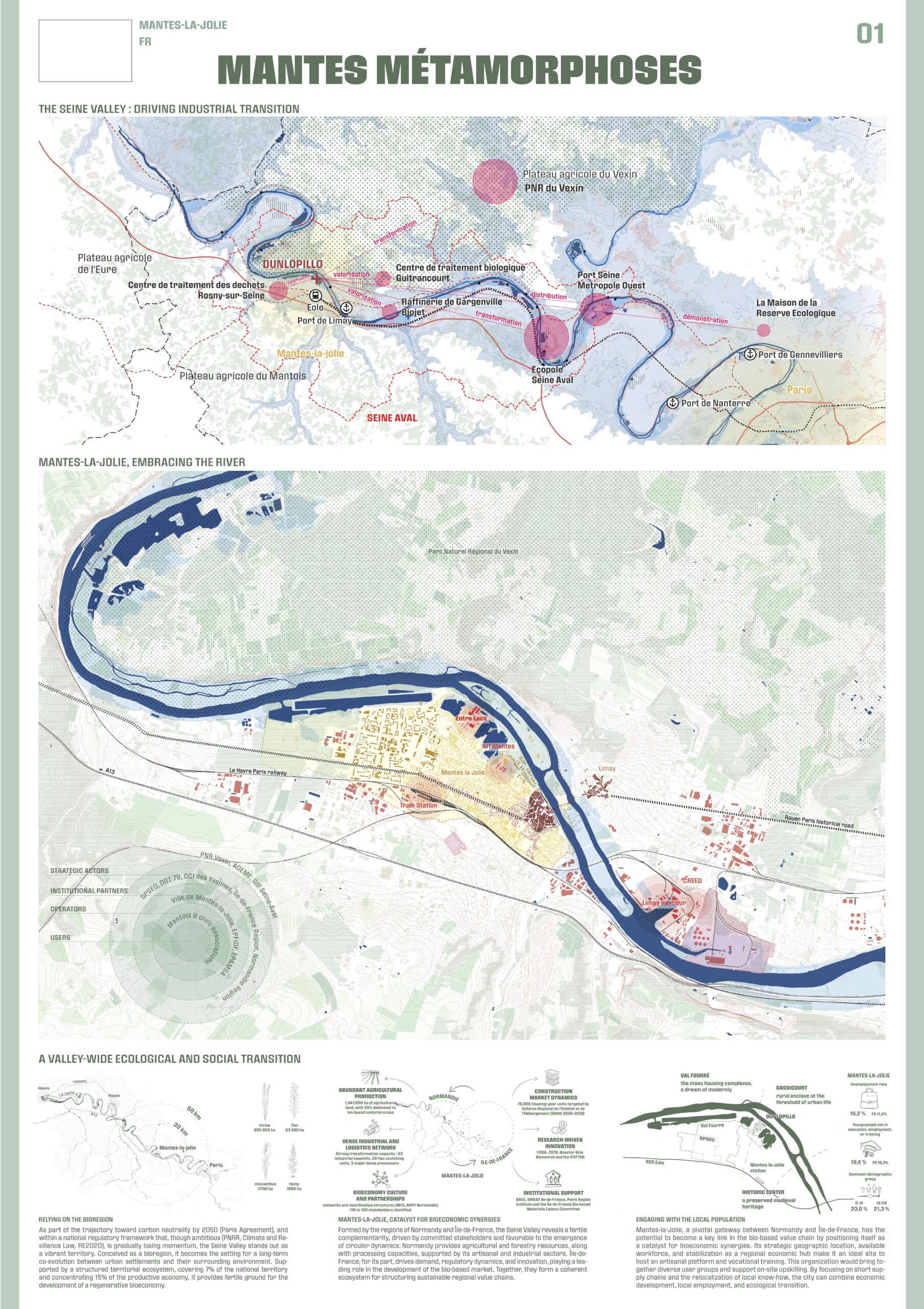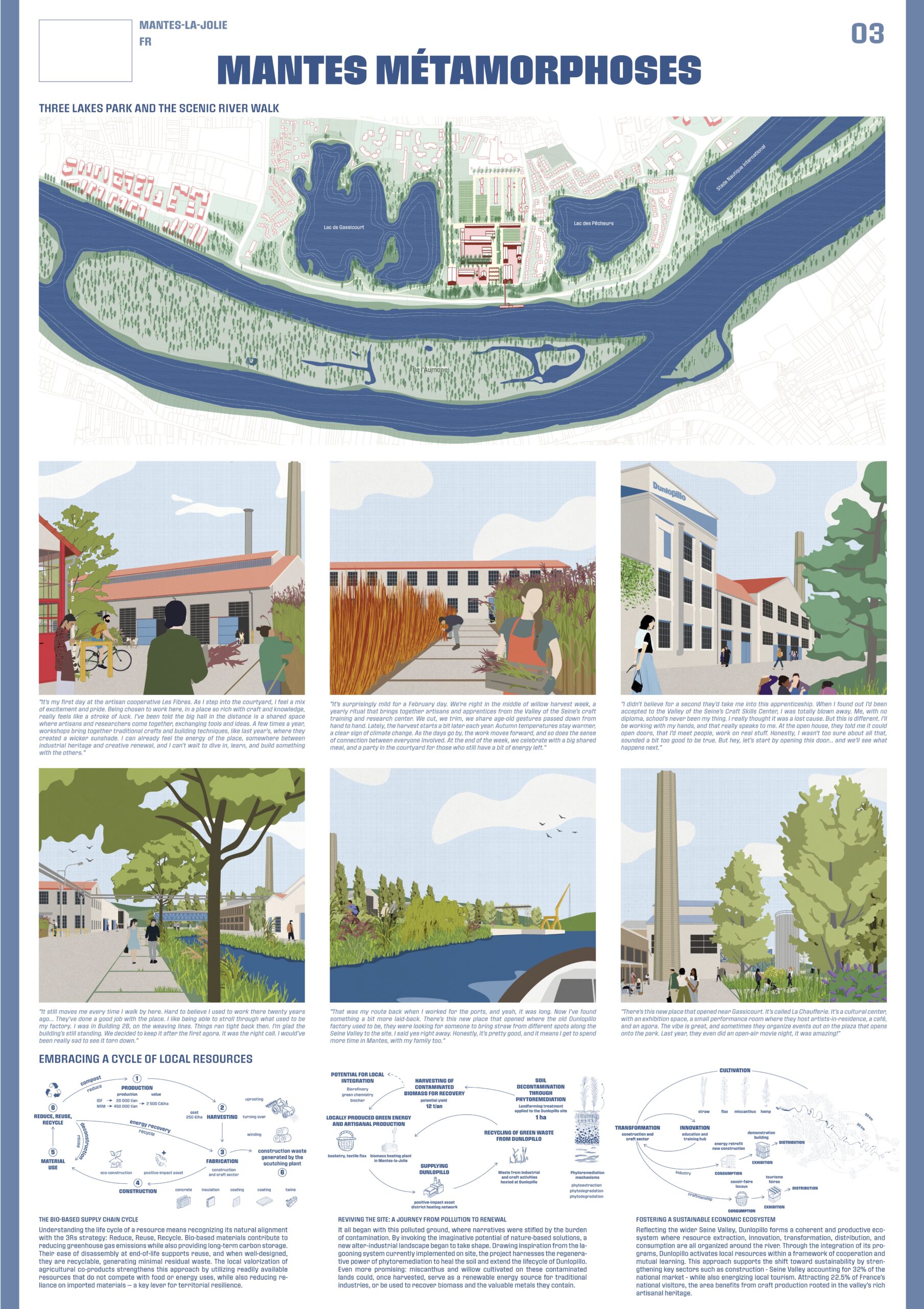 Mantes Métamorphoses est un projet réalisé pour le concours EUROPAN 18. J’ai créé l’ADN et la mise en page des planches en amont avec l’équipe et réalisé les illustrations des perspectives sur le projet de régéneration du lieu de l’Entre-Lacs en nouveau lieu de vie urbaine.