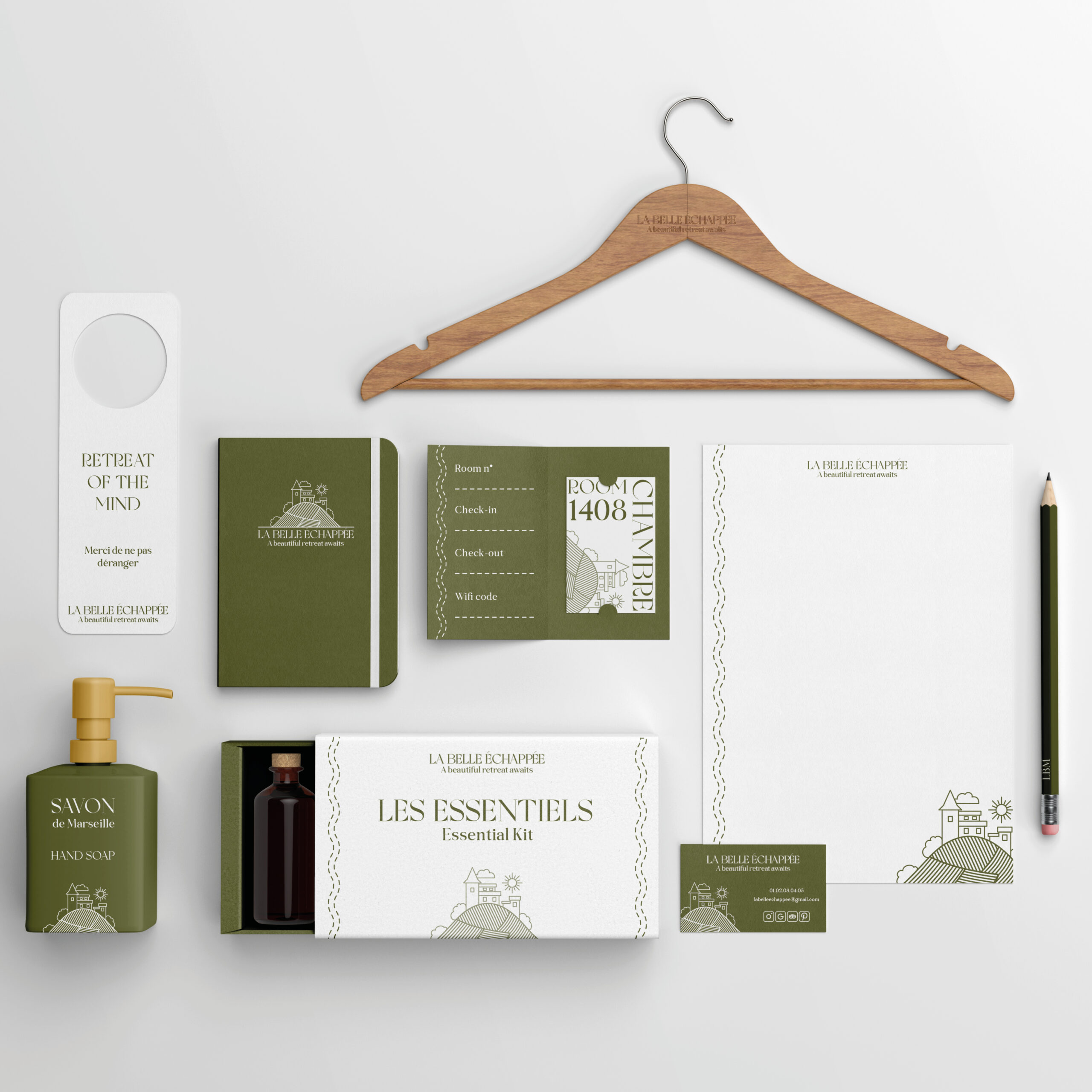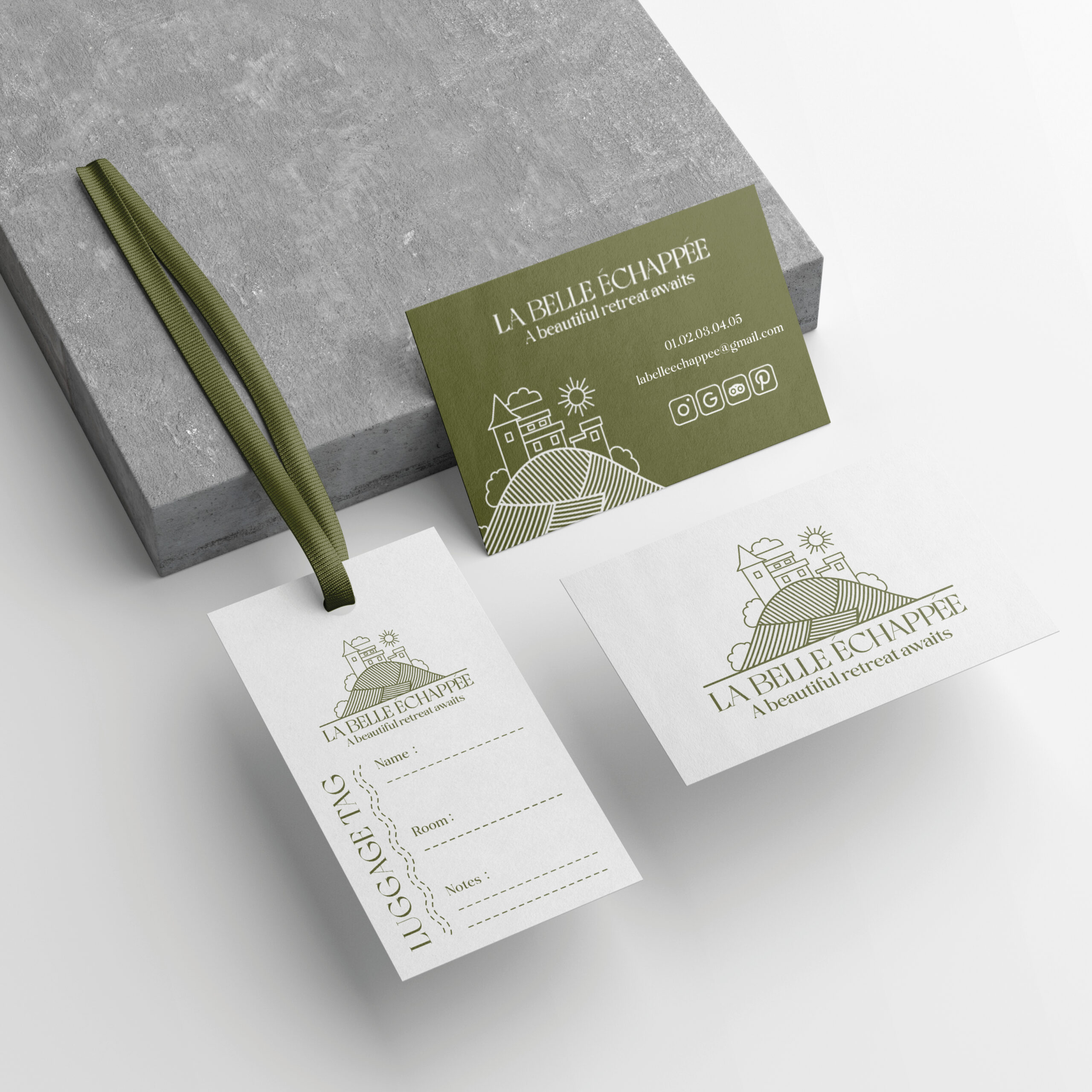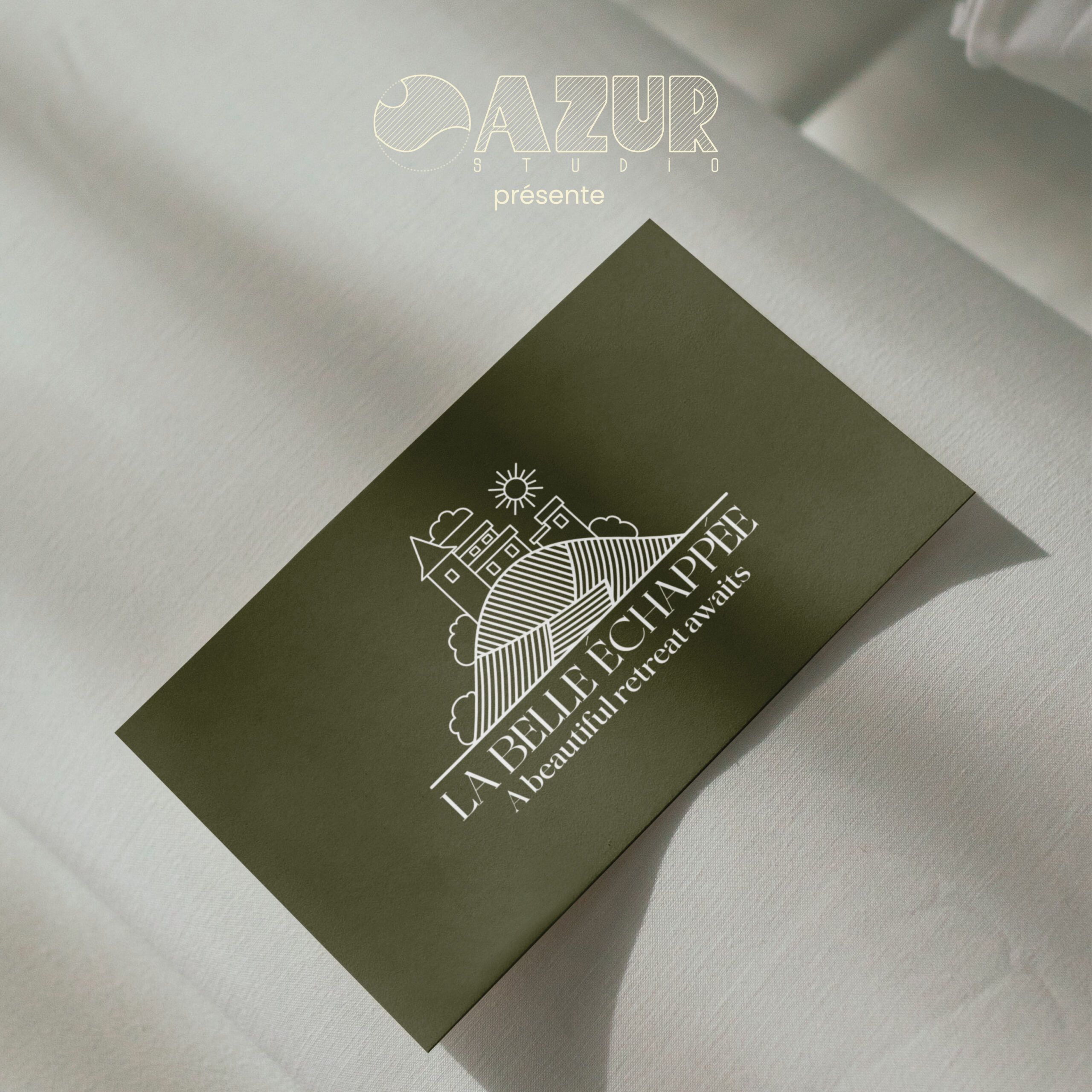 La Belle Échappée est un hôtel de charme niché dans la campagne française, offrant un refuge élégant et paisible. Ils avaient besoin d’un logo, d’une identité de marque, de cartes de visite et de divers supports complémentaires. Je l’imagine comme un magnifique château rénové, entouré de vignes ou de champs de lavande, où chaque détail évoque l’élégance et la douceur de vivre à la française.